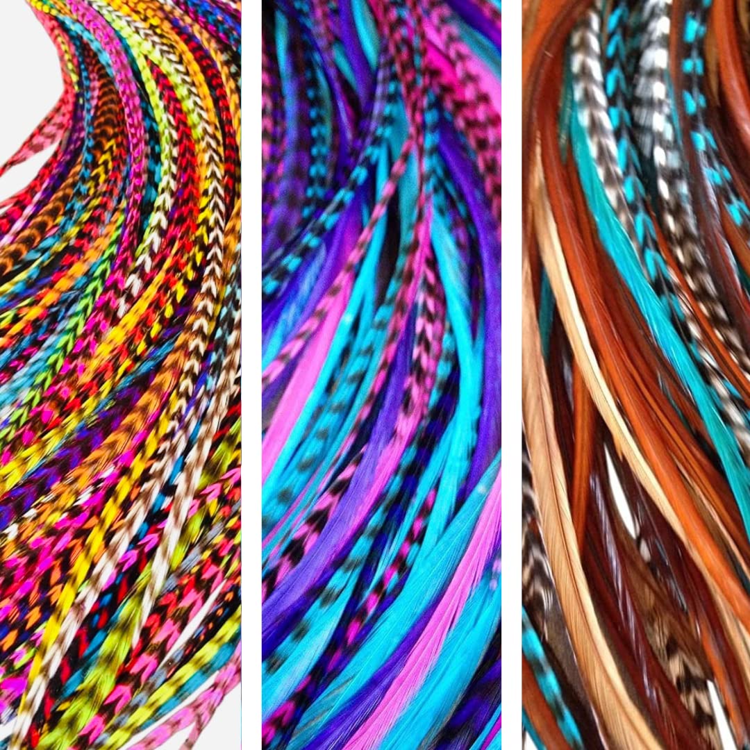 60 Hair Feathers Extension Kit, 100% Real Rooster Feathers, Long Feather Hair Extensions in Pink, Purple, and Blue by Feather Lily