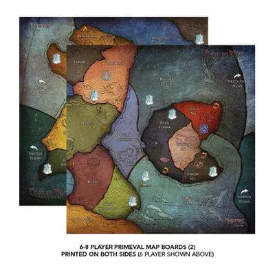 Board Game Supplement by Petersen Games. Includes 6-8 Player version of the Cthulhu Wars Primeval Map (2 sided). Requires the standard Primeval Map Expansion to play.