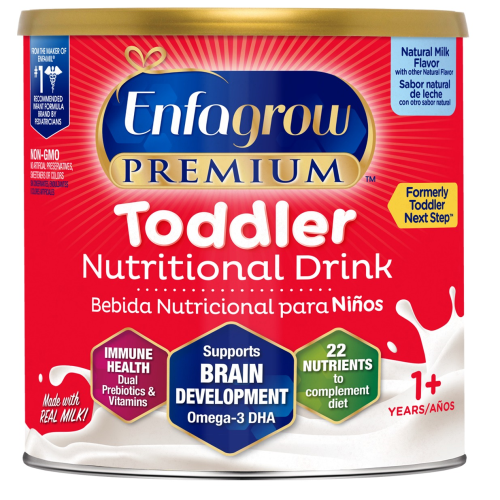 Enfagrow PREMIUM Toddler Next Step Natural Milk is a milk-based nutritional drink for growing toddlers ages 1 year & up. The transition from formula or breast milk to cow's milk can lead to an 80% drop in brain-nourishing DHA consumption. And 85% of brain growth happens in your baby's first three years. That's why it's important to promote your little one's brain development with Enfagrow PREMIUM Toddler Next Step Natural Milk. It contains 26mg of DHA per serving, 2X the amount in Similac's Go & Grow Milk Flavor formula and with 30% less sugar† †Enfagrow has not been shown superior to Similac Go & Grow in supporting brain development. Enfagrow Natural Milk Powder (26 mg DHA & 11 g sugar per serving) vs Similac Go & Grow (12.7 mg DHA & 15 g sugar per serving). *Enfamil is the #1 pediatrician recommended brand of Infant Formula - QuintilesIMS, using the ProVoice Survey fielded from October 1, 2016 to September 30, 2017. **Not made with genetically modified ingredients, but trace amounts of genetically engineered materials may be present in the product from manufacturing environments and process sources