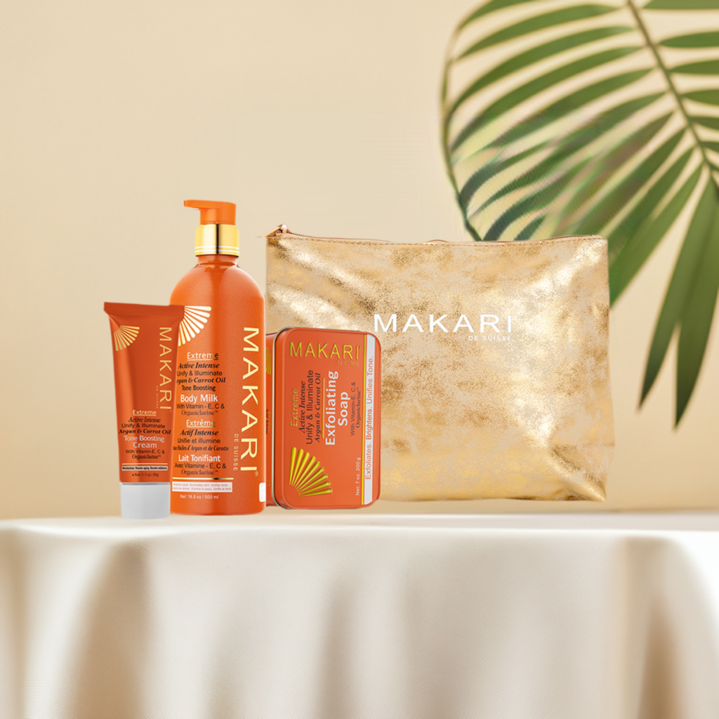 Makari Extreme Argan & Carrot Oil Skin to Love Kit combines our extremely, effective, brightening -alternative illuminating products to reduce hyperpigmentation and reveal skin's radiance. Recommended for dry, normal, and maturing skin types. The kit includes: Exfoliating Soap: Cleanse and exfoliate face and body Skin Toning Cream for Hyperpigmentation: Moisturize and even tone face and spot treat body Toning Milk: Condition and brighten body Caution: The Extreme collection is not recommended for sensitive skin types or first time users of Makari products. The formulas are very powerful and may cause irritation, inflammation or outbreaks. If irritation, inflammation or outbreaks occur, discontinue use immediately. We recommend first time users to start with the Naturalle or Classic Bright Skin collections before progressing to the Extreme collection.