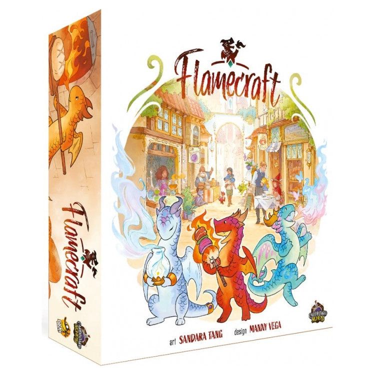 Flamecraft is a fantasy game of city building, worker placement, and hand management for 1-5 players. You take on the role of Flamekeepers, gathering items, placing dragons and casting enchantments to enhance the shops of the town. Dragons are specialized (bread, meat, iron, crystal, plant and potion) and the Flamekeepers know which shops are the best home for each.