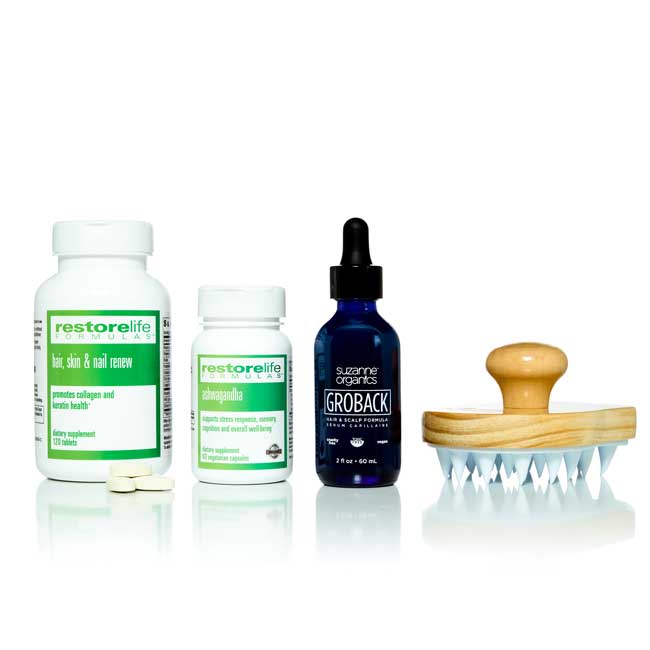 SUZANNE Organics GROBACK is a plant-based, non-drug hair and scalp formula that helps to reactivate dormant hair stem cells and increase their multiplication.