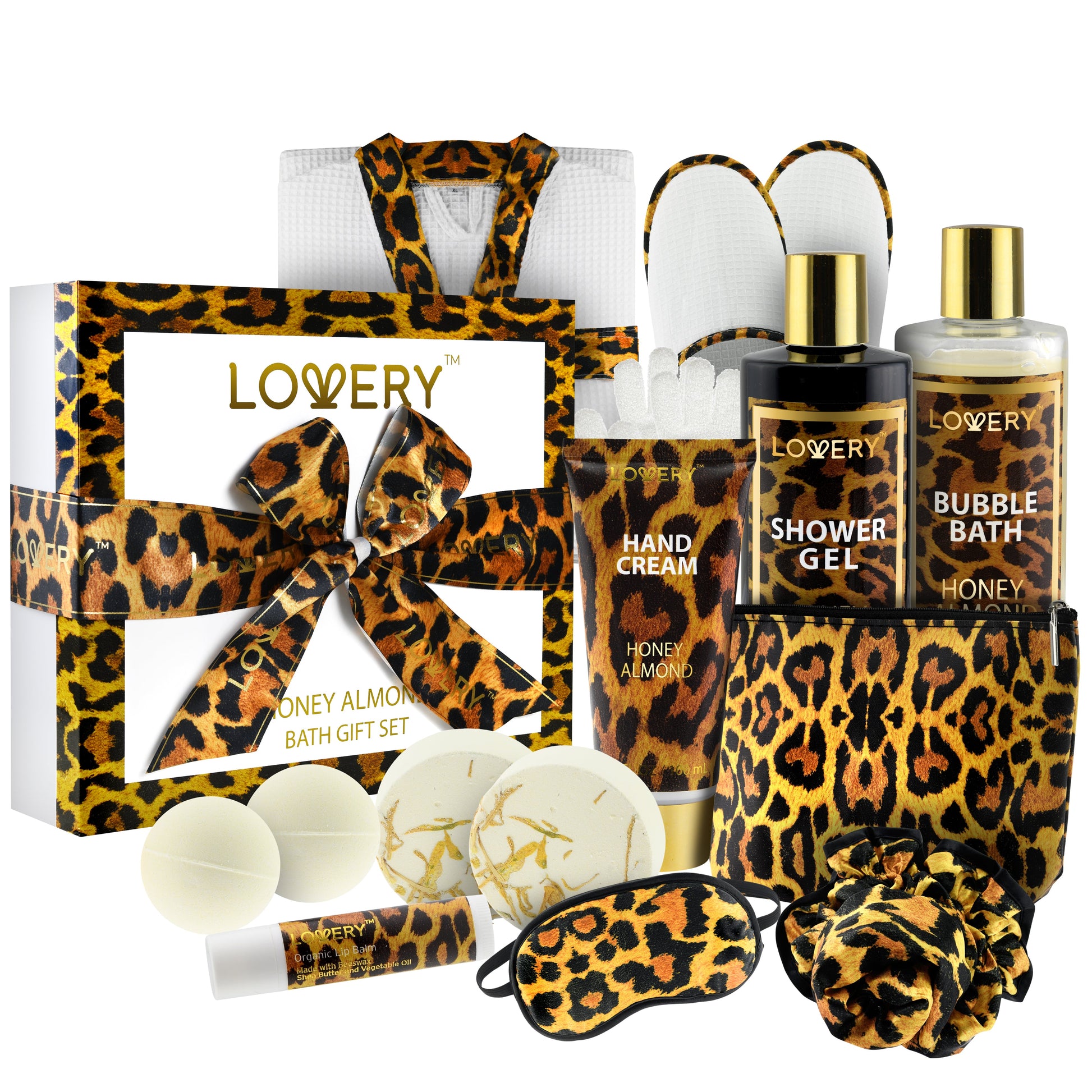 17 PIECES COMPLETE BATH SET - Take a relaxing break as Lovery brings a deluxe spa straight to your home! Our Bath Set contains Shower Gel, Bubble Bath, Hand Cream, 2 Oversized Bath Bombs, 2 Oversized Shower Steamer Tablets, Satin Eye Mask, Leopard Purse, Pair of Shower Gloves, Pair of Leopard Design Bath Slippers, Leopard Designed Bath Robe, Lip Balm wrapped in a Leopard Print Box with a Bow and Hangtag to Personalize a Message.