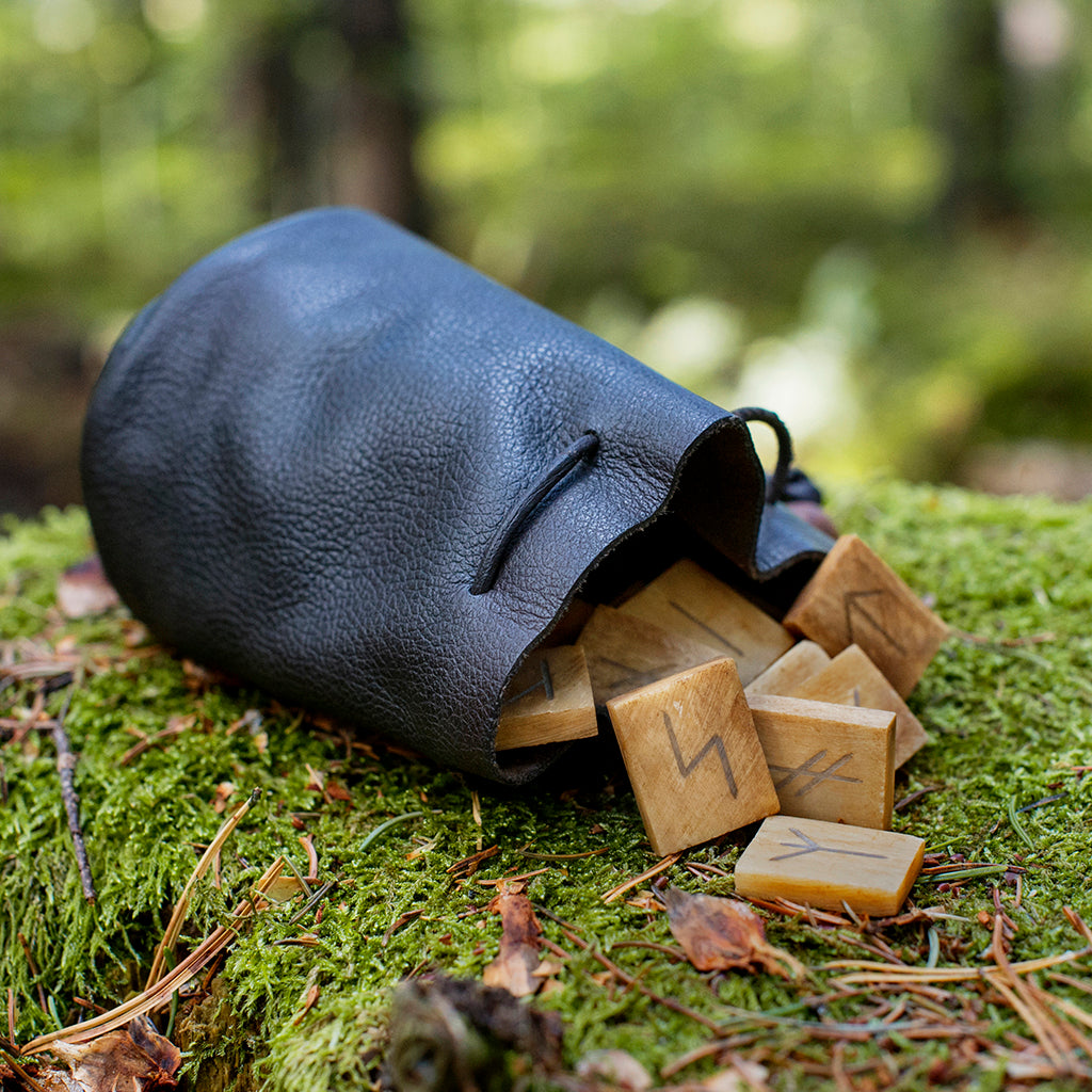 Set of 16 handmade bone tiles, each carrying a carved rune from the Younger Futhark runic system. Use them for games, divination or decoration. The set comes with a leather pouch.