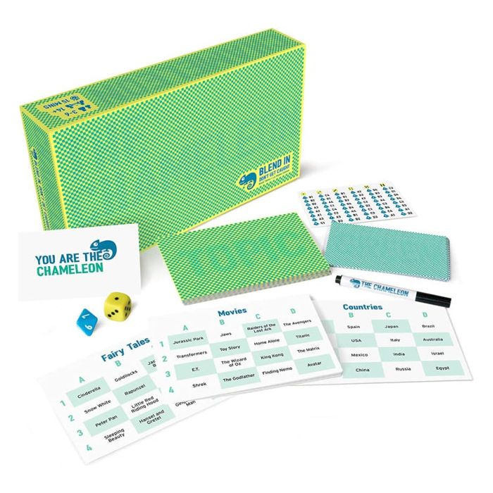 n this board game, your job is to blend in and not get caught. Everyone else is trying to work out who the Chameleon is. Everyone suspects everyone else at the beginning. Using one carefully chosen word based on a secret topic, you each try to smoke out the Chameleon, who doesn't know what the secret topic is.