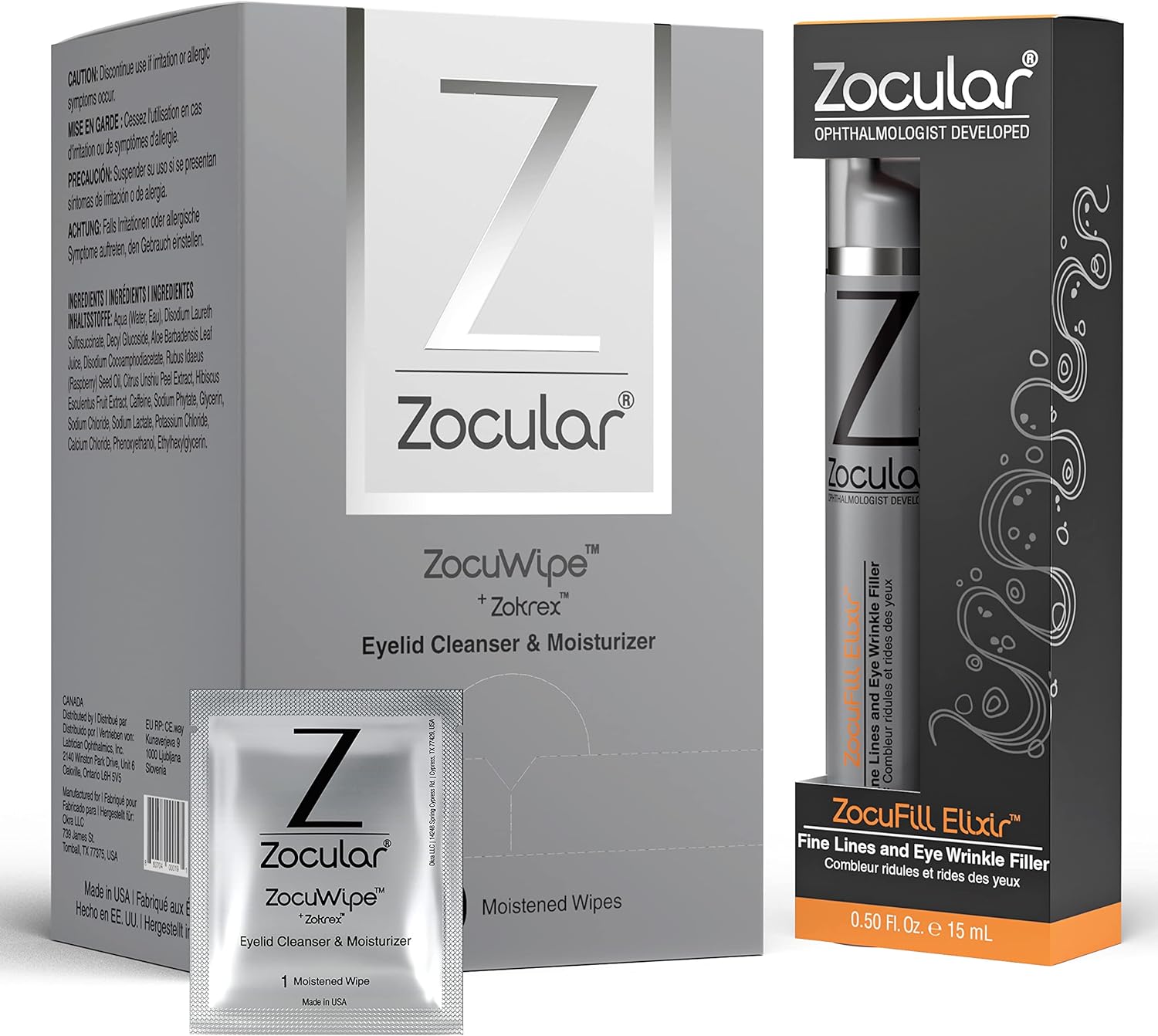 Zocular Zocuwipe Eyelid Wipes with Okra Complex - Eyelid Cleanser and Moisturizer Pads 40ct + Zocufill Elixir Eye Gel and Face Serum